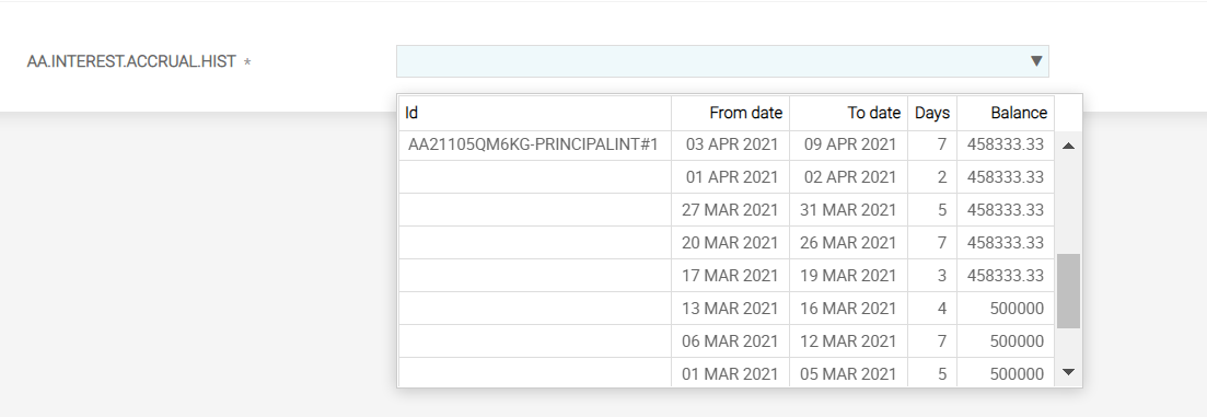 • For each archival, the system creates a unique ID in the AA.INTEREST.ACCRUAL.HIST table and the format of this ID is: <AA.INTEREST.ACCRUALS record ID>#n, where n denotes the sequence number of the archival process.