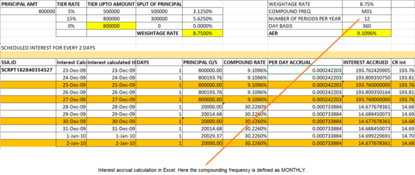 • The archival process for interest accruals can be done only for arrangements with multiple schedules (that is, multiple Period Start and Period End entries) and not arrangements with only one schedule (till maturity). This is because at least the current period (Period Start and Period End) should be available in the live interest accruals record.