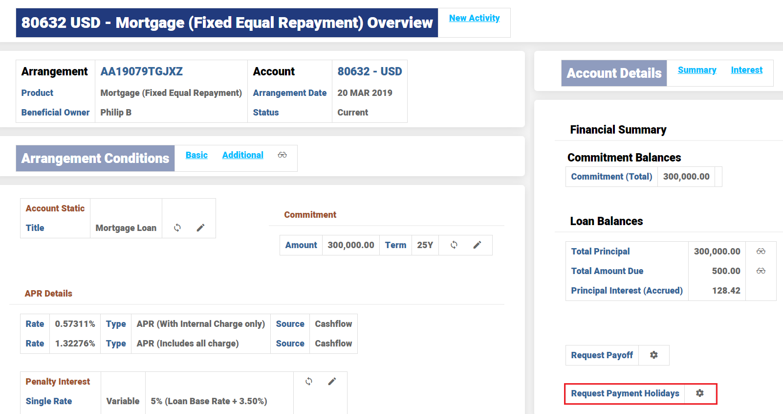 The Payment Holiday is a transaction (soft) Property Class which is used to skip an installment completely or skip part of the installment amount for a defined period.