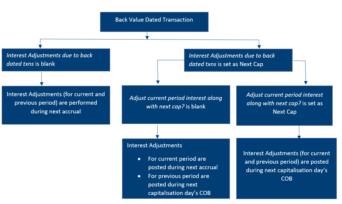 When a back-value dated transaction takes place within the current interest period, the system adjusts the interest accruals (from the back-value date till current date) on the next capitalisation date’s COB
