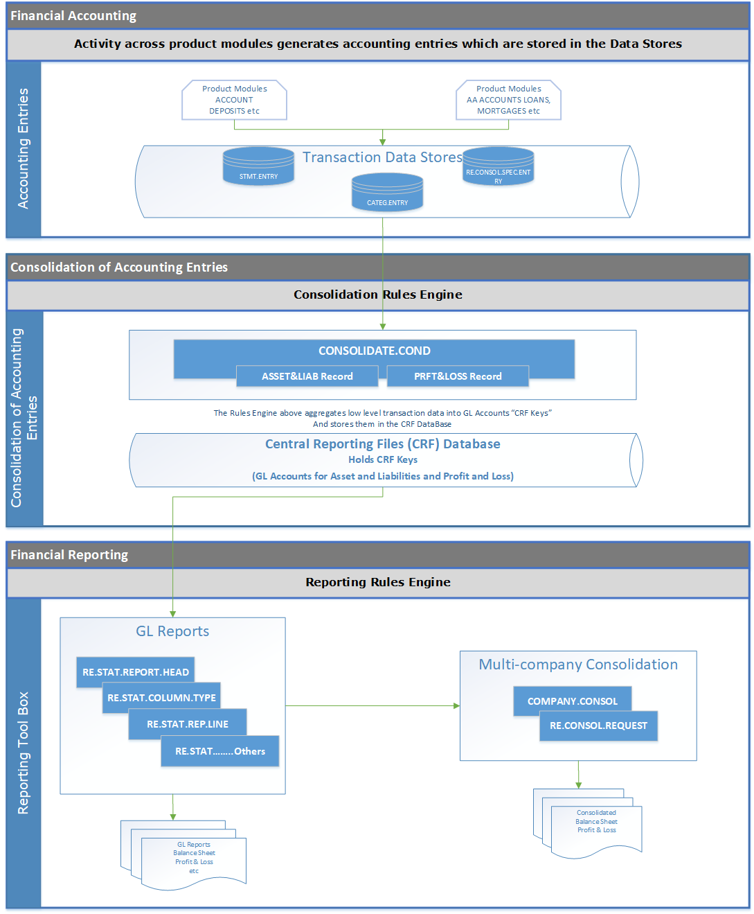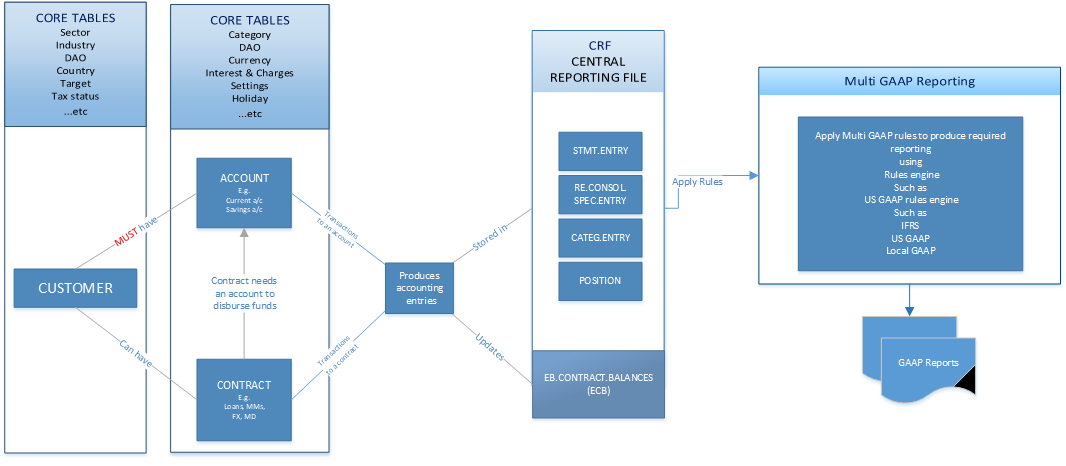 The following diagram shows the conceptual view of accounting and reporting in Temenos Transact Transact.
