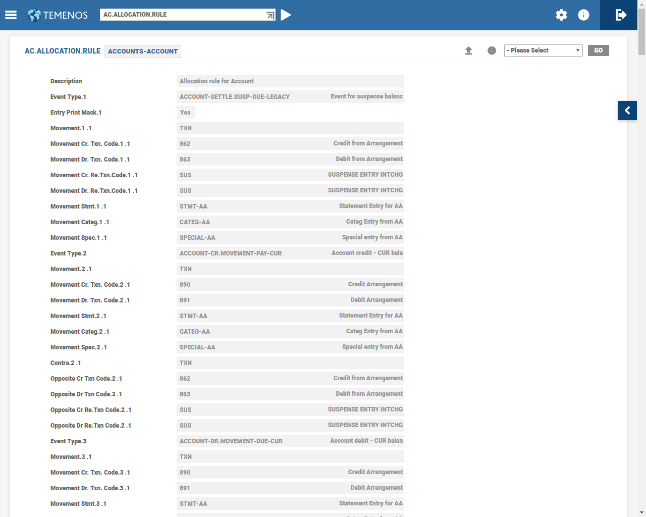 AC.POSTING.DETAILapplication and its defined contents are used to control the mapping of values, that is, references and narratives of accounting entries, such as STMT.ENTRY, CATEG.ENTRY, and RE.CONSOL.SPEC.ENTRY. - A STMT.ENTRY (STMT-AA) record created in