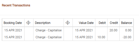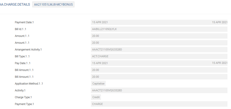 These charges can be debit charges collected from customer or credit charges that can be paid to the customer. Only a flat amount can be collected or paid as a charge. The Issue Bill activity is triggered on the settlement arrangement for the activity or scheduled charge to get processed. The defined charge will only be capitalised against the defined settlement account. The Generate Charges Activity is used by the system to capitalise these charges to the liquidation account mentioned in the Settlement condition.