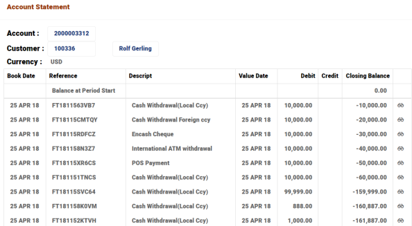 Once the FT is authorised, the arrangement that is linked to account number 84581 appears with an amount of USD10000 credited to it. Hence, the ledger and available balance is updated, which includes limit amount (of 10,000).