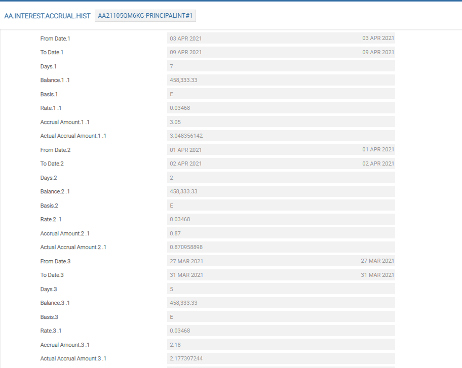 The following screenshot shows the AA.INTEREST.ACCRUALS before the archival takes place and it can be seen that there are nine Period Start and Period End set of values.