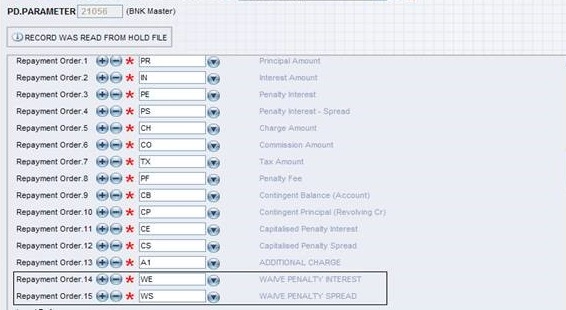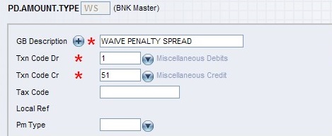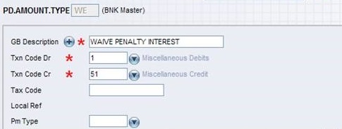- Two PD.AMOUNT.TYPE values, namely WE and WS needs to be added for waiver of penalty interest and spread respectively.