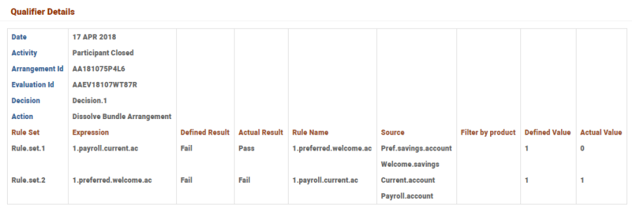 • Product qualifier rules are used to define a rule in an arrangement to arrive at a result, and the result of the rule triggers another Activity on the same arrangement or a linked arrangement.