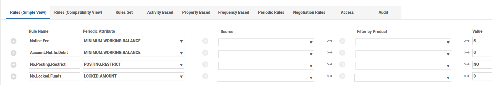PROP.EVALUATE User can specify the Interest / Charge Property for which one or more rules should be evaluated. User can specify if the rule(s) should be satisfied or broken and depending on the result the Property has to be applied or waived.
