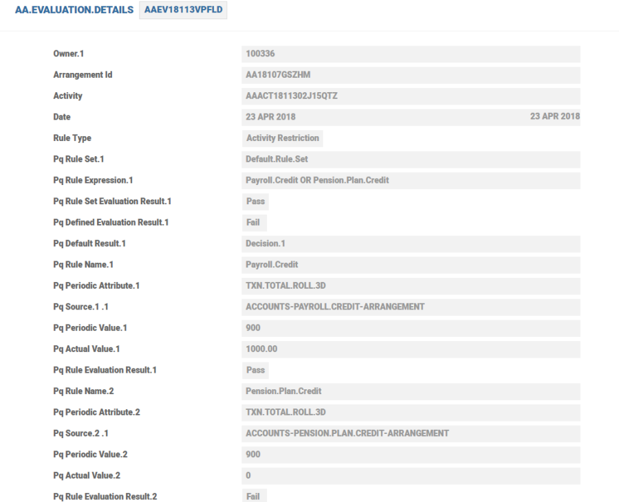 EVALUATE The EVALUATE action is initiated automatically as part of any activity processed by the system. The EVALUATE action performs the following: Check to see if the current AA.ACTIVITY is restricted according to the AA.ARR.ACTIVITY.RESTRICTION definition of the product. If there is a restriction, an error or override appears as specified in the Restriction Type attribute. If the current AA.ACTIVITY is not restricted, then it is possible for any PR.ATTRIBUTE linked to the AA.ARR.ACTIVITY.RESTRICTION definition for the product to be evaluated in turn. Processing within the AA.PERIODIC.ATTRIBUTE.CLASS may contain condition processing based on product and activity—Read Periodic Restriction section for more information.
