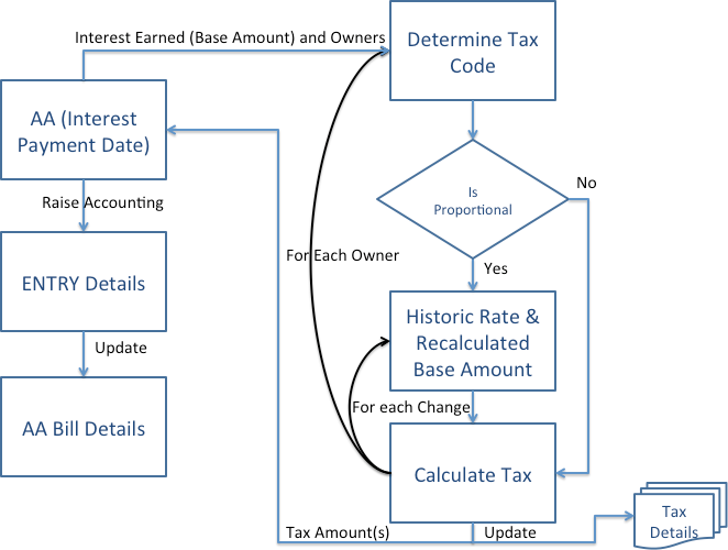 • After configuration, when the Tax Engine detects a change in the Tax Rate during the current Interest Payment period, then it splits the Interest earnings by Tax Rate Change periods and calculates the Tax proportional to the Interest earned within each of those periods.