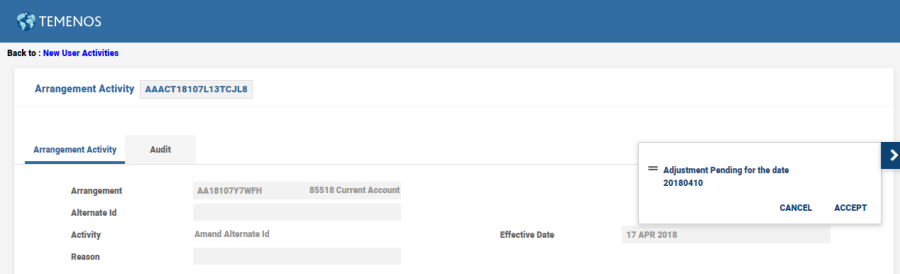 NOTE: If another backdated Transaction/Activity is booked on the same Arrangement where the Value date goes further in the past, then the Pending Adjustment date is overwritten with the older date.