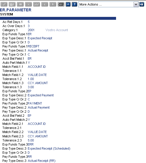 The ER.PARAMETER application defines the account and account type (category) to be monitored for expected receipts, payments and for some other parameters. The following are the possible records in this application: