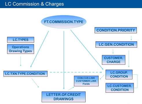 These impact the file CUSTOMER.CHARGE, where the effect of these is seen and additional changes are made. Periodic commission can be defaulted from LC.TXN.TYPE.CONDITION. For LCs, based on operation defined (O, A, P), the commission code is defaulted at the contract level. For drawings, based on drawing type defined (AC, DP), the commission code is defaulted at the contract level.