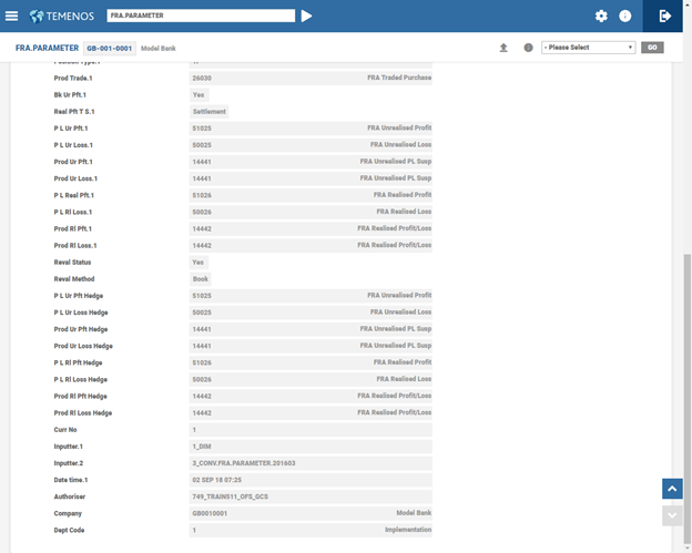 FRA.PARAMETER file defines the basic information to process the FRA deals. Every Company has its own FRA.PARAMETER record that allows FRA processing to be specific to its business environment. Information such as default FX text, interest rate variance, rate fixing days, rate fixing report, settlement formula, revaluation rules, etc. are part of the table.