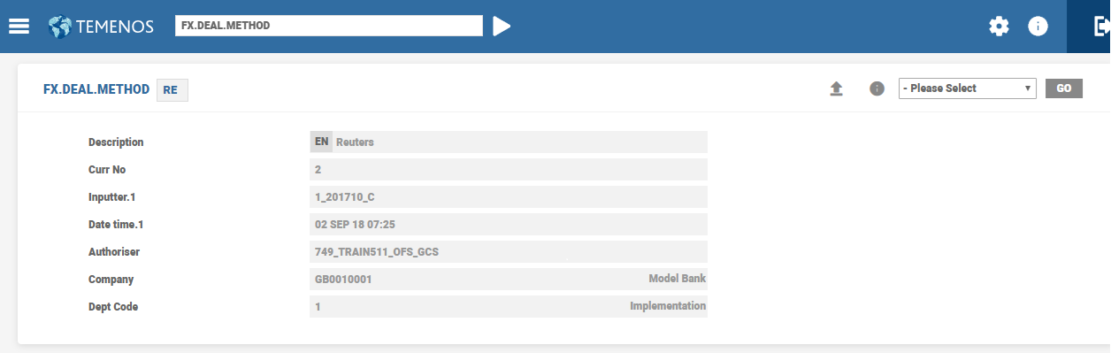 Initiation of deals happen over multiple ways. This can be through an intermediary such as a Broker (in which case the BROKER record is setup), or through other means, such as Reuters or Bloomberg dealing systems, Telex or telephone. The FX.DEAL.METHOD table allows users to define which deal methods are applicable and use the information on advices.
