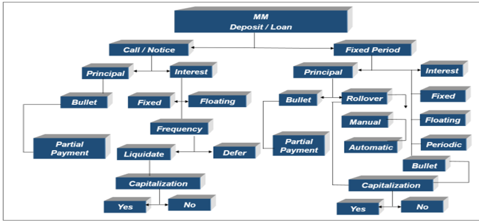 Certain features specific to retail deposit and loan products are, generally, not applicable in interbank MM business. Therefore, it is essential that the functions and features of MM module are relevant to the standard interbank MM business.