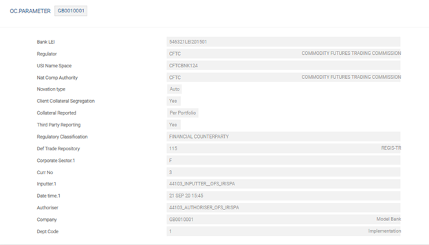 The parameter tables are mandatory to enable the OTC reporting functionality. In the below screenshot, the Corporate Sector field (in a record for the bank) is mapped to reporting data.