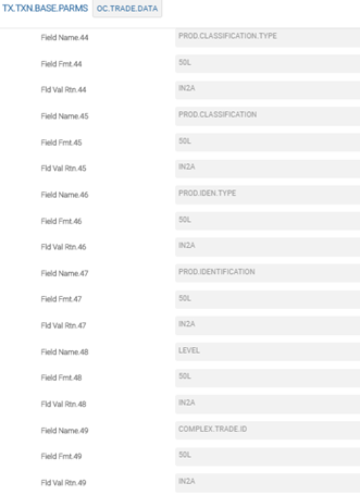 A sample TX.TXN.BASE.PARMS record for OC.TRADE.DATA is shown in the below screenshot.