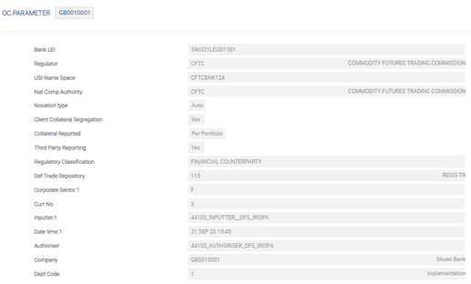 The Treasury applications (Foreign Exchange, Non-Deliverable Forward, Forward Rate Agreements, Swaps and Derivatives) have fields that allow to capture data for Markets in Financial Instruments Directive (MIFID) regulatory reporting. The OC module (OTC Clearing) acting as the framework to: