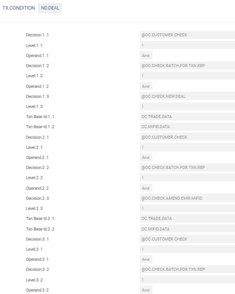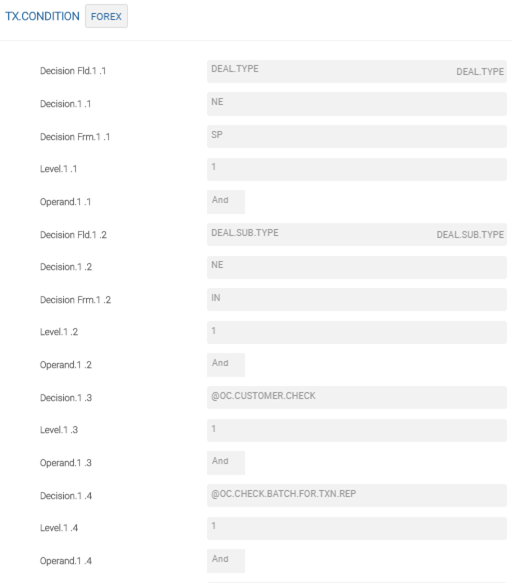 This application defines whether the database is for a particular application or needs to be updated. The ID of TX.CONDITION record is the application name. For example, FOREX, ND.DEAL, SWAP, FRA.DEAL, and DX.TRADE. Although, one application allows one TX.CONDITION record, the user can define conditions to update multiple databases.