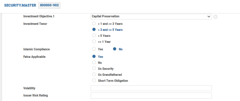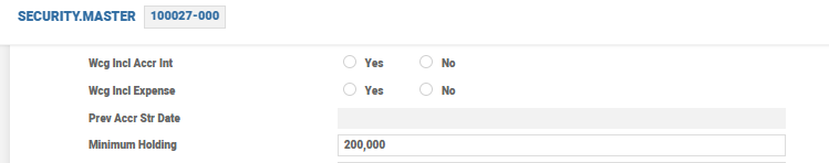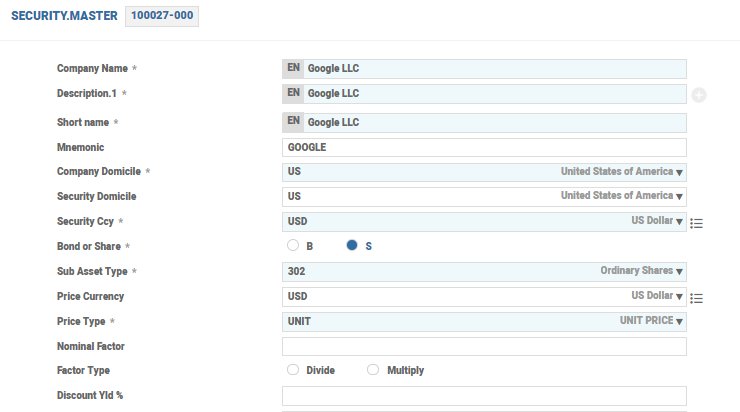 The Company Domicile field refers to the country of the parent company issuing the security. The Security Domicile specifies the country where the security is issued. The Security Ccy indicates the place where the security is issued and the Price Currency field indicates the currency in which the security is traded. This field accepts a valid record from the CURRENCY application. The below screenshot is an example of a record in SECURITY.MASTER.