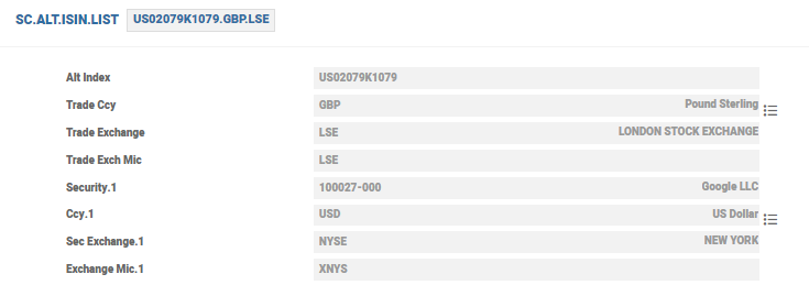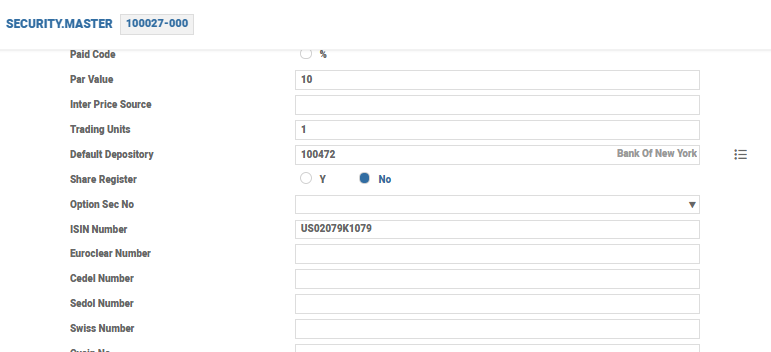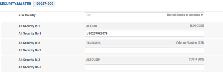 Once a record in ALT.SEC.PARAMETER is created, the system automatically updates all the records in SECURITY.MASTER and adds this value to the Alt Security Id multi-value field. A sample record of SECURITY.MASTER with the unique identifier added is shown in the below screenshot.