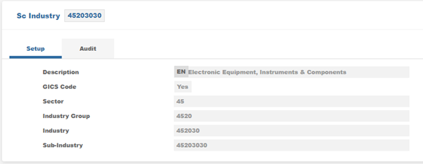 The ID of this application can accept a maximum of eight characters. This application also supports GICS codes. If the Gics Code field in SC.INDUSTRY is set to Yes, the system updates the Global Industry Classification Standard (GICS) hierarchy fields automatically. The GICS hierarchy is as follows: