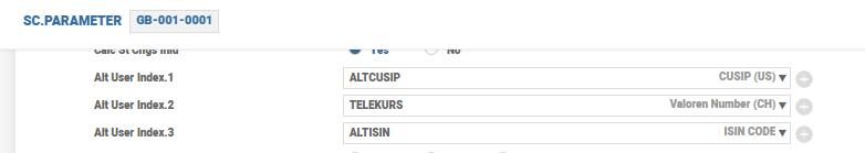 A specific way to reference security identifications is to use the Alt User Index field in SC.PARAMETER application. This method of indexing the SECURITY.MASTER application is an alternative way for using the Alternate Index field (as detailed earlier in this user guide). The created records in ALT.SEC.PARAMETER must be added to the SC.PARAMETER application.