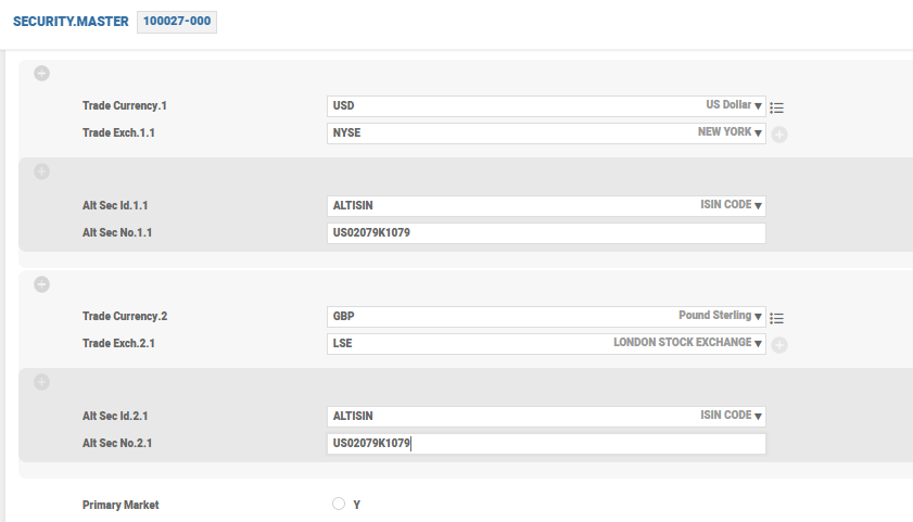 The Trade Currency, Trade Exch, Alt Sec Id and Alt Sec No fields are part of an associate multi-value set and can be used to define the various currencies and exchanges in which the security is allowed to be traded and also the relevant alternate index that is applicable. These fields can be set only if the Alt Index Check field is set to YES in the SM.PARAMETER.
