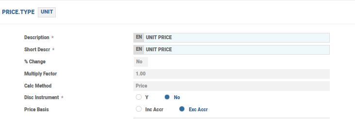 This application indicates the system how a price type calculation is to be performed within any given transaction in the Securities module. The Multiply Factor field indicates the weighting attached to the price quoted on a security. For example, if each unit of the nominal amount represents an option on 1000 shares, then the value in this field will be 1000. In order to accrue or amortise the discount amount when a security is traded, the Disc Instrument field must be set to Y. This process is carried out only for the bank’s own portfolios.