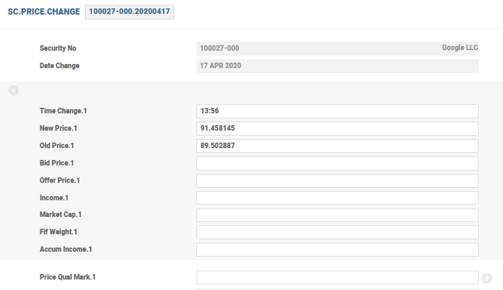 The SECURITY.MASTER application need not be launched every time when the user updates price or income. The SC.PRICE.CHANGE application allows the user to make any changes as required and stores the historic price or income data, whenever there is a change in the Last Price, Date Last Price and Price Qual Mark fields in SECURITY.MASTER.