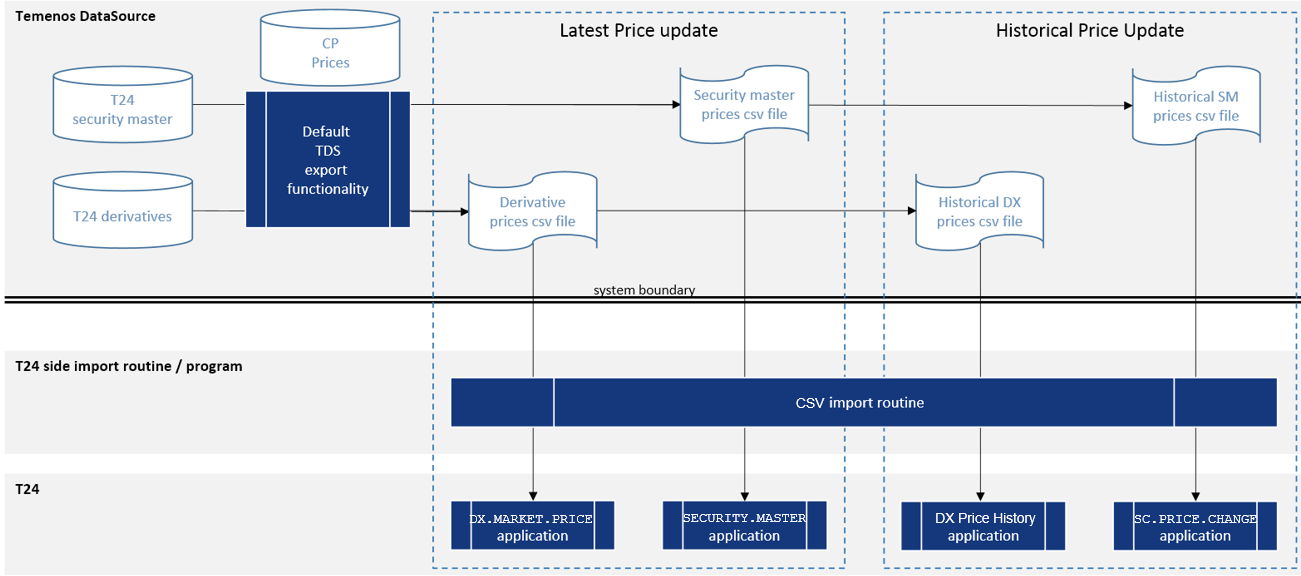 Price can also be updated automatically via TDS (Temenos Data Source). The below image demonstrates how price is updated in SECURITY.MASTER application and how historical prices are stored in SC.PRICE.CHANGE application through the TDS interface.