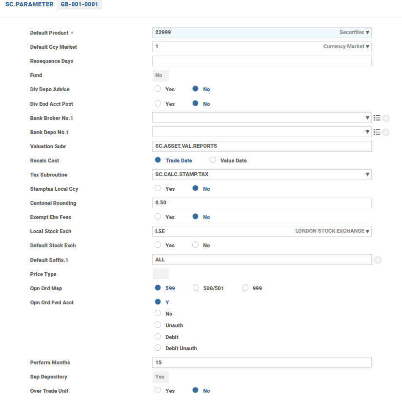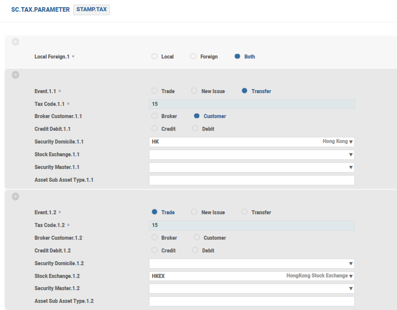 The SC.TAX.PARAMETER application is used to define stamp tax. Different tax rates can be applied based on the application, security, stock exchange, sub-asset type and so on.