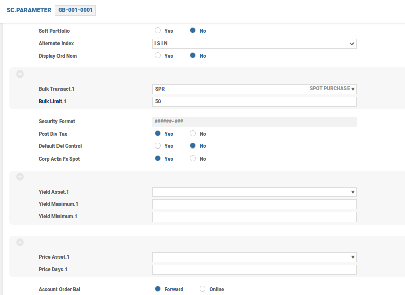 SECURITY.MASTERID. If this is set to Yes, the system does not perform the formatting ofSECURITY.MASTERreference, based on the format specified in the Security Format field in theSC.PARAMETERapplication. - The Alt Index Check field is used to default the