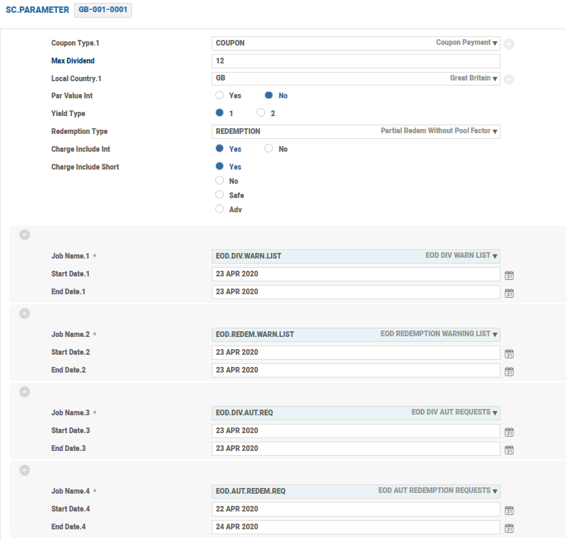 If this field is updated, then the diary records are automatically created by EOD.DIV.AUT.REQ and EOD.DIV.AUT.REQ. The user can set the start and end dates and the system creates diary records where the bond’s coupon or maturity date falls within the range. The date range is automatically recycled by the system once the COB is completed on the end date.