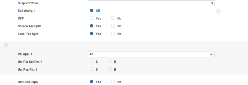 | Source Tax Split and Local Tax Split | Used to process corporate action events. If these fields are set to YES, separate source or local tax accounting entries is posted. The customer is posted with the gross amount for the cash entitlement and a separate entry for source or local tax amount. |