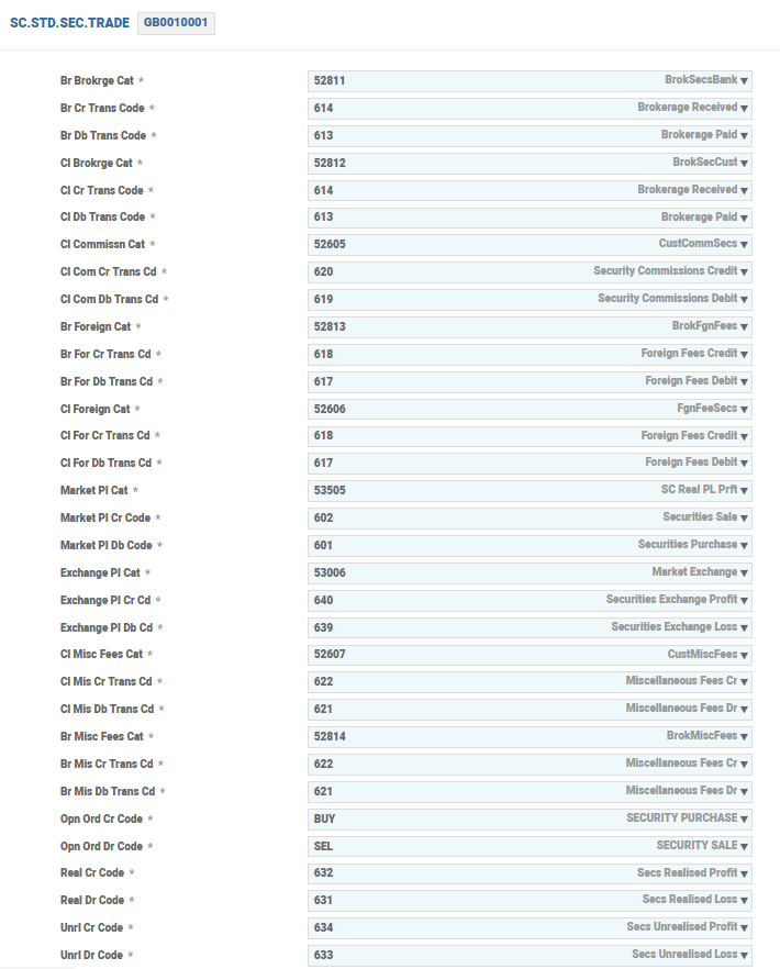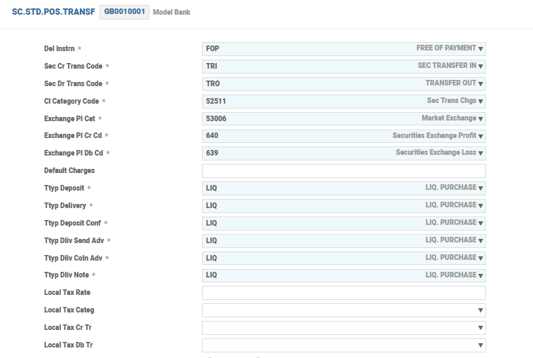 The SC.STD.POS.TRANSF application contains the company-level default values, which are used to process the POSITION.TRANSFER, SECURITY.TRANSFER and SC.BULK.TRANSFER transactions. It allows the user to specify the default charge category for the bulk charges and specify the status for the record in SECURITY.TRANSFER generated from the bulk transfer. The initial fields contain many CATEGORY and TRANSACTION codes relating to debit and credit transaction entries posted during the transfer out and in as shown in the screenshot below: