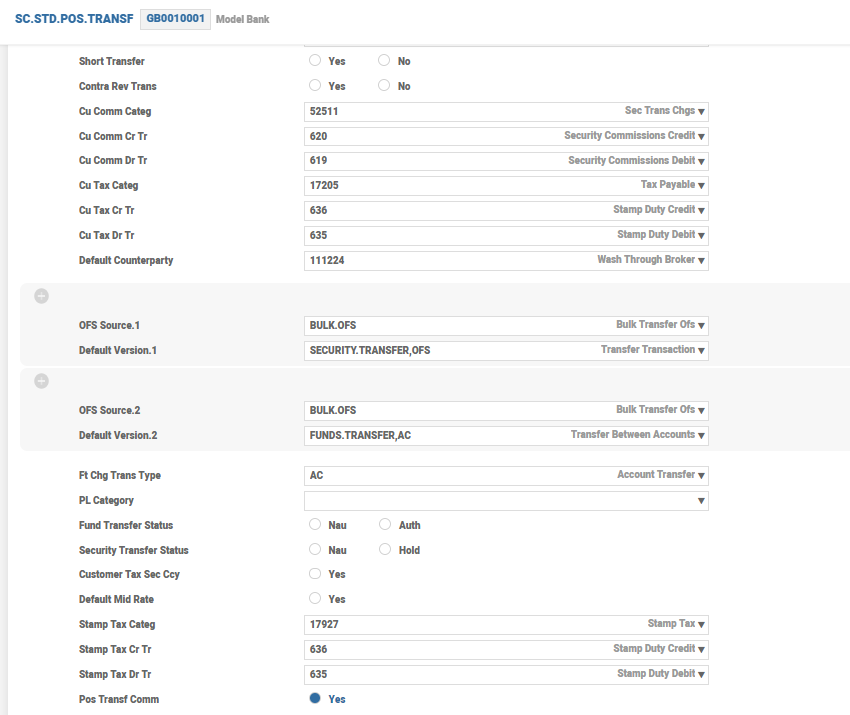 If the Short Transfer field is set to Yes, the system allows transfer of short position.The Ofs Source and Default Version fields are used to create and authorise the applications used in the SC.BULK.TRANSFER application. The Stamp Tax Categ field is used for defaulting category for stamp tax posting from security transfer, where the Stamp Tax Dr Tr field defines the debit transaction code for the stamp tax posted and the Stamp Tax Cr Tr defines the credit transaction code for the stamp tax posted.