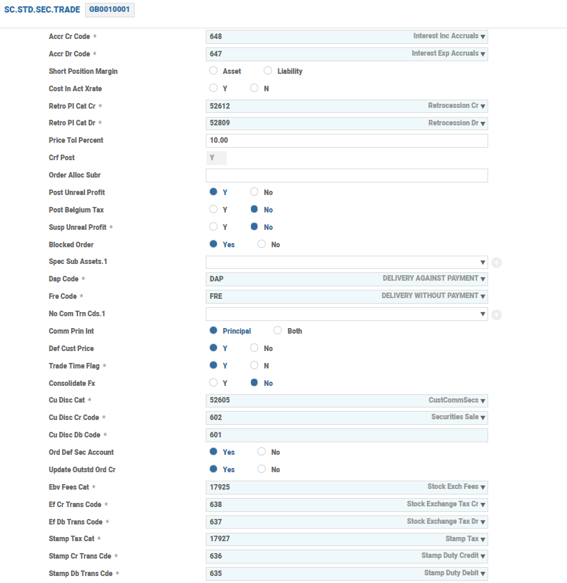 | Sod Acctg | Controls the system-generated accounting. The available values are ALL and NULL. When this field is set to ALL, the account postings generated from the transactions of all the SC applications (including corporate action events) are posted on the value date. These transactions are included in the start of day batch on the value date. The COB batch considers only those transactions that are not included in the Start of Day (SOD), for example, transactions entered on their value date. |