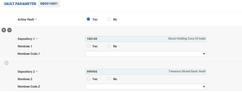 Before Temenos Transact begins to control the contents of the vault, it is mandatory to complete the configuration of the VAULT.PARAMETER application, which enables the system to identity the vault(s), depositories or areas within the vault. The VAULT.PARAMETER application is required for each company to use the vault application facilities provided by Temenos Transact. The vaults must also be set up on the records in CUSTOMER and CUSTOMER.SECURITY before they are defined in the VAULT.PARAMETER application. This application controls whether vault (safecustody functionality in Temenos Transact) is turned on or off, and which depositories are turned on or off. If the vault is active, then records in the VAULT.EXPECT application can be produced from the VAULT.CONTROL application.