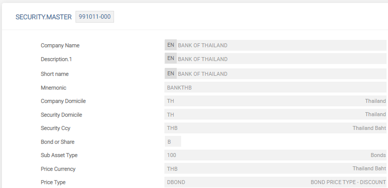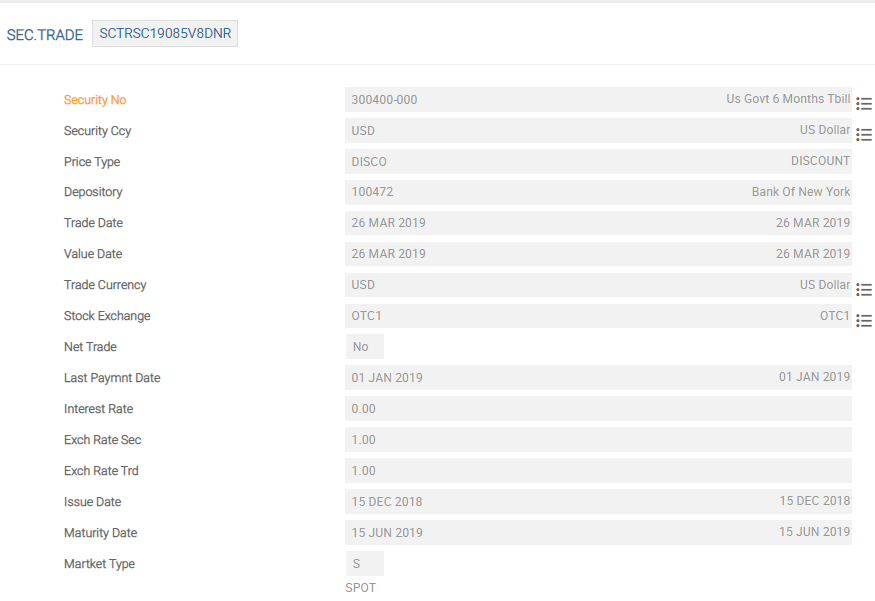 The no-input fields can indicate the choice the user made in an earlier field or display the defaulted or no-change system calculated amounts and so on. For example, the Security Ccy and Price Type fields are obtained from the SECURITY.MASTER application appertaining to the security that the user enters in the Security Code field. These assist the user during the completion of the remainder of the transaction and are an aid to ensure that the user has selected the correct security. The above example uses a Bond type Security, which happens to be non-interest bearing. However, had the transaction been an interest bearing security then the details such as Interest Rate and Interest Days must have indicated that the current interest rate and the number of days are elapsed as the last coupon date and the value date of the trade respectively. For share type transactions, interest is non-applicable.