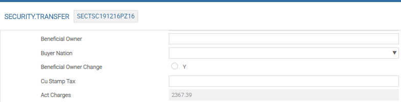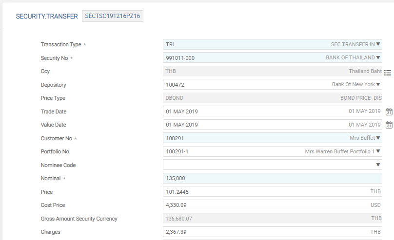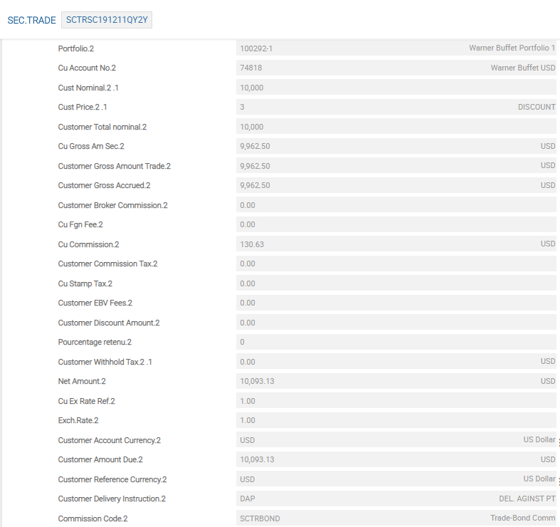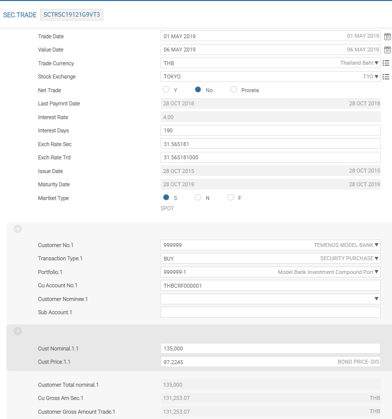 | Customer Total Nominal, Cu Gross Am Sec, Customer Gross Amount | Indicates the total number of the security and the value of the transaction (before addition of other items such as tax, charges and interest) in both security and trade (settlement) currency. As the user progresses through the transaction and if the user validates the record, Temenos Transact automatically calculates various information. For example, post input of the price relative to the trade, the next three fields Customer Total Nominal, Cu Gross Am Sec, Customer Gross Amount Trade are populated depending upon the amount of the security traded and the price . As both the nominal and price fields are sub-values, the user can enter tranches of purchases or sales for the same customer portfolio. |