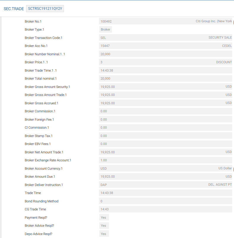 However, if the user has arranged to make a purchase or sale of the securities on behalf of the customer(s) and/or the organisations’ own portfolios through either a counterpart or counterparts, broker or brokers, the user has to complete the Broker No field and most of those following fields. The following screenshot displays the broker portion of the SEC.TRADE when completed.