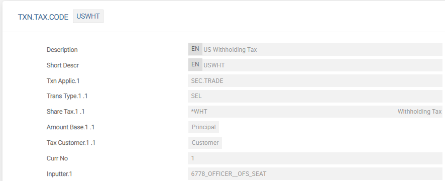 If the TXN.TAX.CODE record US (as shown in the above screenshot) is specified in the Txn Tax Code field in SECURITY.MASTER, WHT is computed for trades involving the security based on the conditions specified here. This table allows a separate TAX or TAX.TYPE.CONDITION record to be defined for shares and bonds and the base amount must be used for computation of tax which can be the principal or both (principal + accrued interest). The following fields are also related to withholding tax.
