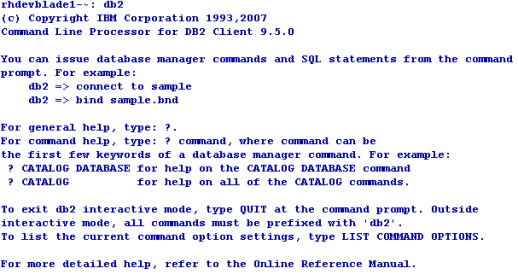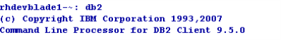 The version of the DB2 server is visible when db2 command is executed.