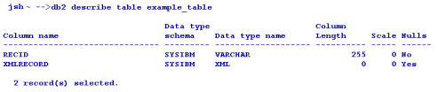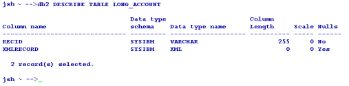 The following screen capture displays an Oracle describe, which shows the table type to be different from the short tag XML CLOB table description