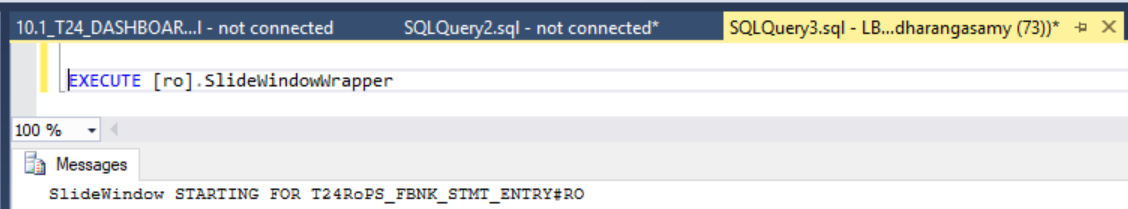 The SlidingWindowWrapper procedure moves forward the partitions by a month and archives all the records in the oldest partition of every table in the partition scheme classified as ARCHIVAL_IDENTIFIED and ARCHIVAL_STATUS=’Y’. This further loops all the identified tables or partition schemes and requires no additional parameters. The EXECUTE [RO] SlideWindowWrapper command executes this procedure. This command pre-validates the F_RO_ARC_CONTROL table for records with COMPLETED status.