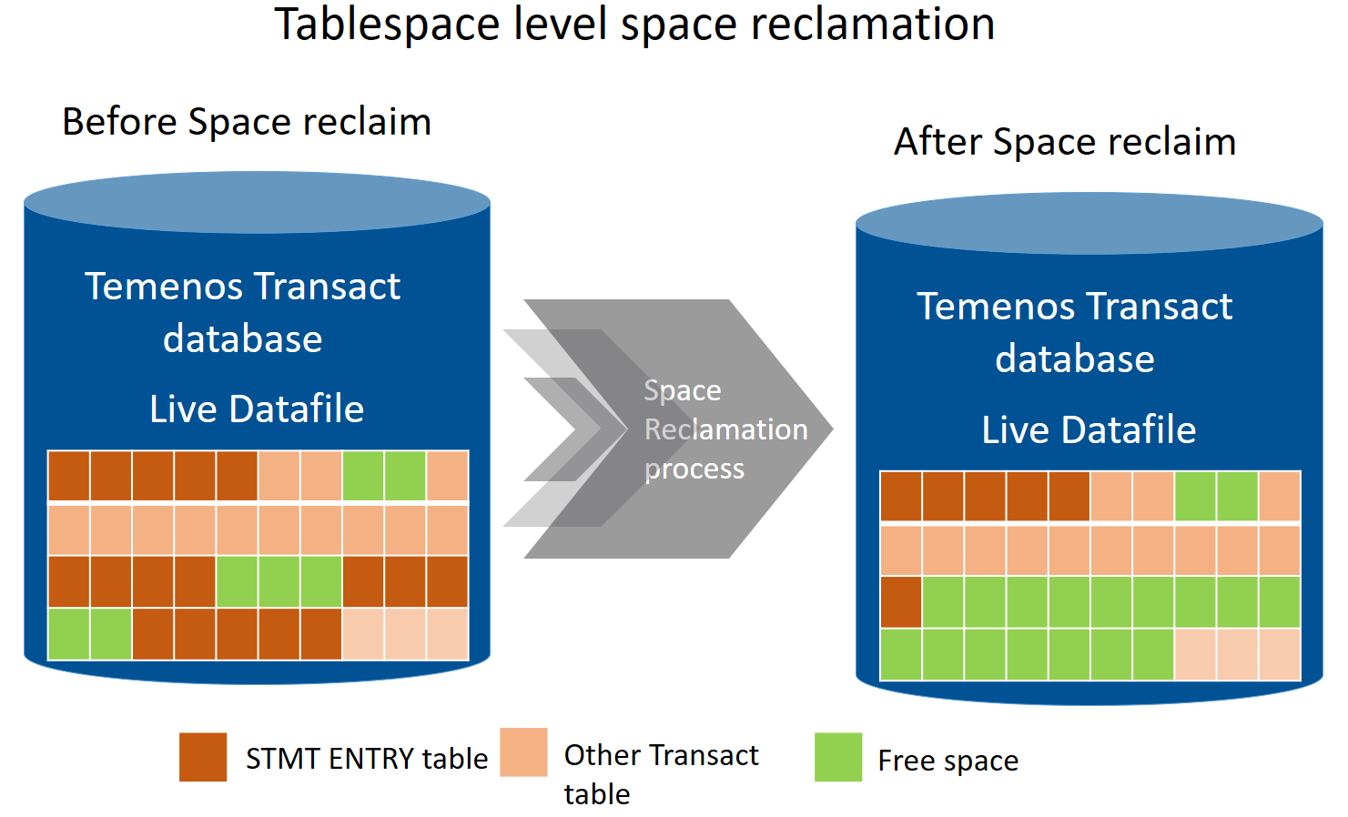 The following illustrations show the Temenos Transact LIVE tablespace before and after the deletion of the STMT_ENTRY table, respectively.