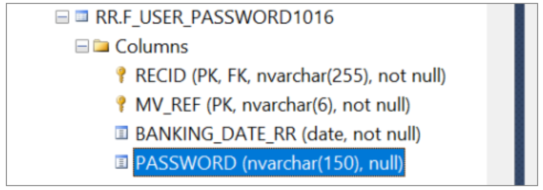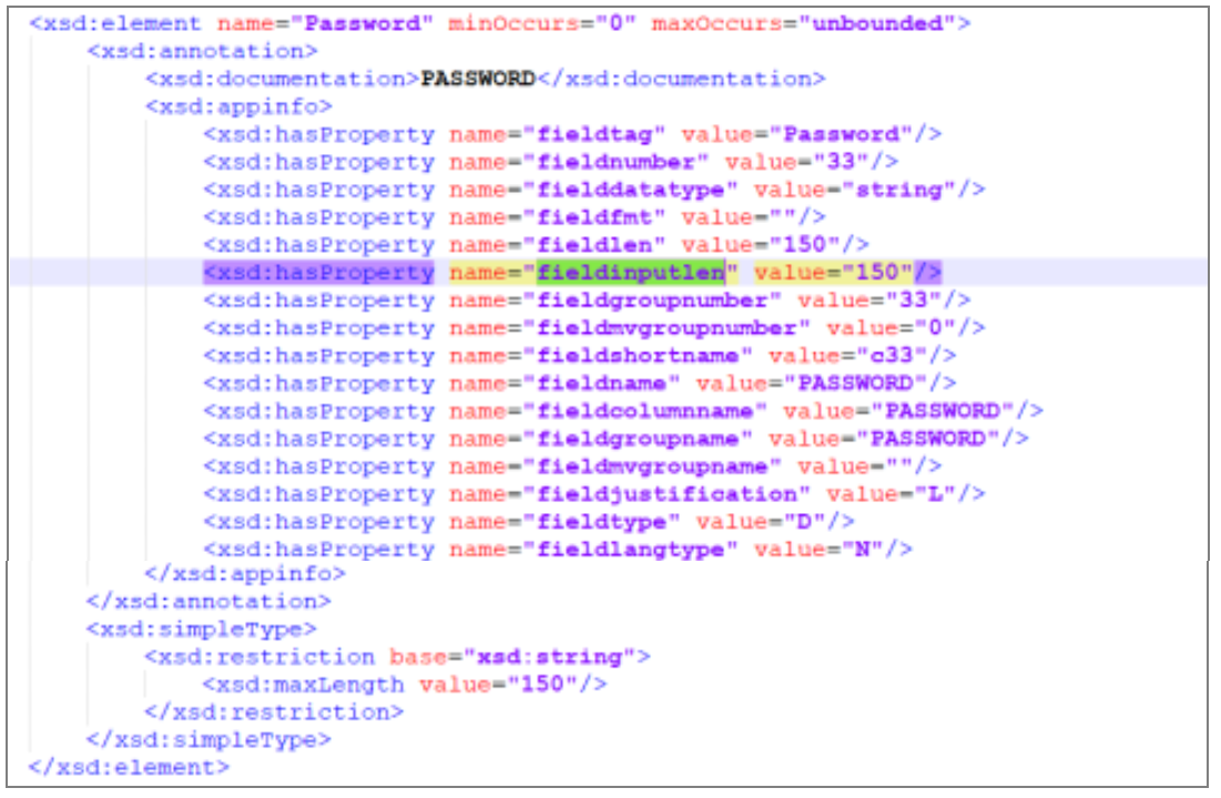 - Note that the fieldinputlen value for the PASSWORD field has been updated to 150 automatically. This value comes from the RR.OVERRIDE.PARAMETER table.