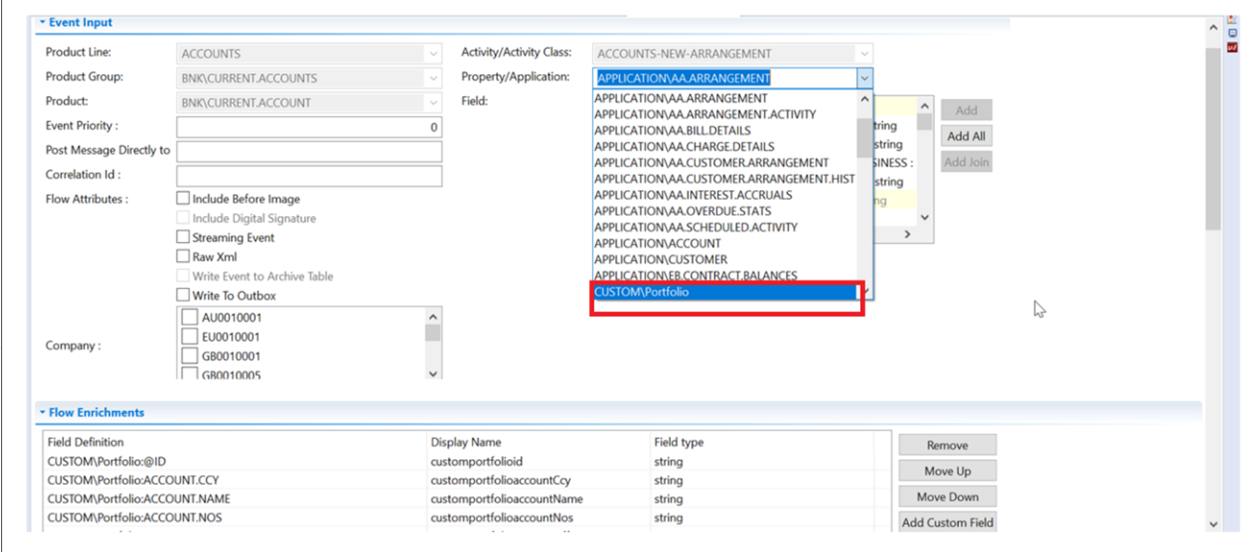 Once Application Name and Data Collection Hook are configured in Event Designer (EDS), the list of applications that are configured in the CUSTOM-PROPERTY.CLASS gets listed in the Property/Application drop-down list. The list starts with CUSTOM as shown in the below screen capture.
